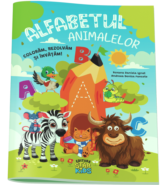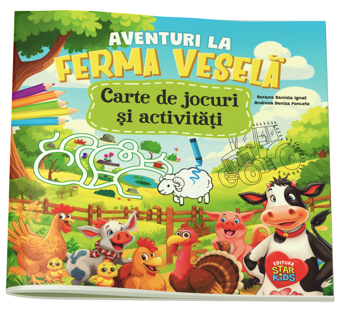 Carte Alfabetul Animalelor, format C5 color, 60 pagini – cuprinde poezii, activități și exerciții pentru fiecare literă a alfabetului SAU Carte Aventuri la Ferma Veselă, format 210×210 mm color, 32 pagini – cuprinde jocuri și activități distractive.